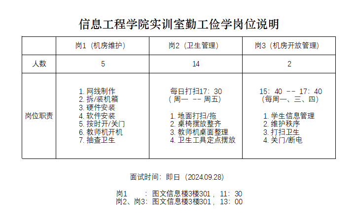 本次招聘共设置三个岗位:实训室管理维护、实训室卫生管理以及实训室开放管理。为了挑选出与岗位最适配的员工,老师们在面试过程中设置了一系列具有针对性的考核环节。