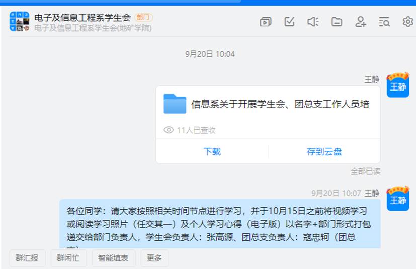 为进一步打造清新阳光员工会形象,明确员工会工作人员主责主业,牢记服务同学宗旨,9月20日,系团总支在员工会群中召开2021-2022第一学期第一次工作人员培训会议,并在群中发布了学习任务卡项目。
