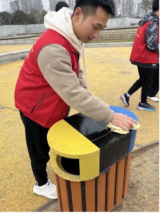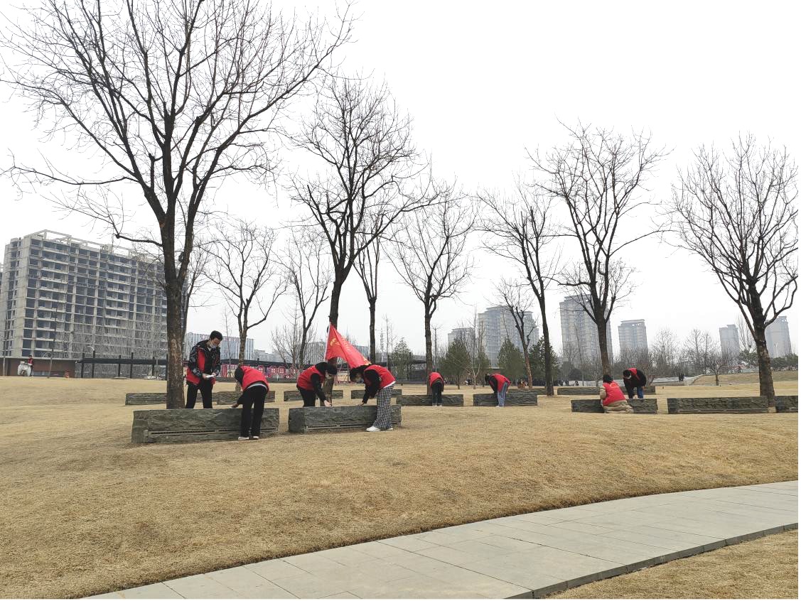 公园是社区生活的重要空间。郑信公园位于多个居民社区中间,是周围市民散步娱乐的重要场所,园内设置了诸多长椅石凳,供市民放松休息。志愿者们发扬不怕苦、不怕累、不怕脏的精神,细心地着眼小事,将草坪上的标语牌扶正,随手捡起地上的垃圾,擦拭落灰的石凳。红色的身影散布在各处,在初春的公园带去了奔涌的朝气和活力