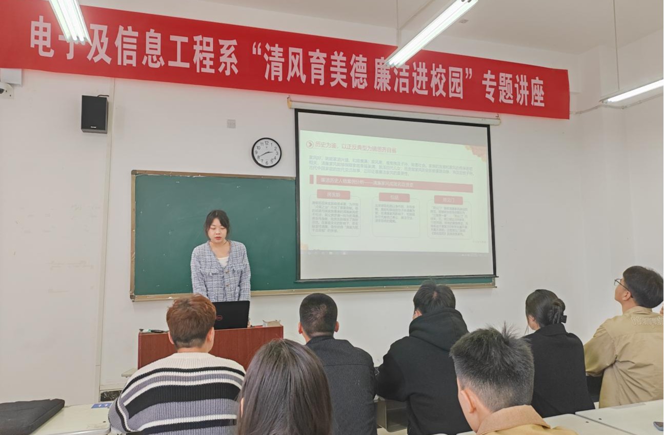 为进一步厚植校园廉洁文化土壤,坚定我系员工理想信念,强化“不想腐”思想行动自觉,落实“一体推进不敢腐、不能腐、不想腐”的新时代全面从严治党重要方略,营造思廉品廉、崇廉尚廉的良好风尚。4月26日,电子及信息工程系开展“清风育美德 廉洁进校园”专题教育讲座,由辅导员白金风主讲,信息系各班级员工干部参加。