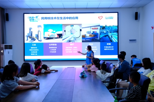 宣讲团成员杨芳婉为主讲人,主讲内容为核技术在公共安全及医学领域的应用。宣讲开场,杨芳婉先向小朋友们科普了什么是“两弹一星”精神。结合“一起‘核’家欢科普动画片”“大圣归来”这两个动画视频,以小朋友更易接受的方式,向他们说明“核技术在生活中无处不在”。通过PPT图片内容讲解“X射线辐射成像技术”以及“中国‘八五’科技攻关大型集装箱检查系统”。其次,列举一些核技术在生活中的典型应用场景,采用通俗易懂的语言,来进一步讲解核技术在公共安全领域的应用,通过视频“幽门螺杆菌的危害”向小朋友及科普核技术在医学领域的应用。最后以“核力出奇迹”动画来结束此次的宣讲。宣讲过程中,杨芳婉也使用图书、印章、教具等物资,与小朋友们进行互动交流。活动后,宣讲团成员带领小朋友一起做手工,感恩母亲,拍摄合影。