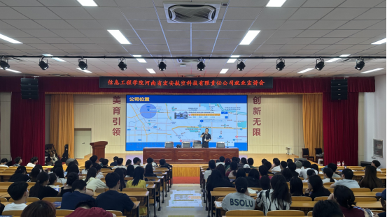 宏安航空科技企业代表结合当前就业前景,介绍了公司的情况,主营业务、优势及核心力、招聘岗位及岗位需求,并向同学们分析了近几年的需求变化及该公司做过的具体项目、研究方向、员工待遇等。